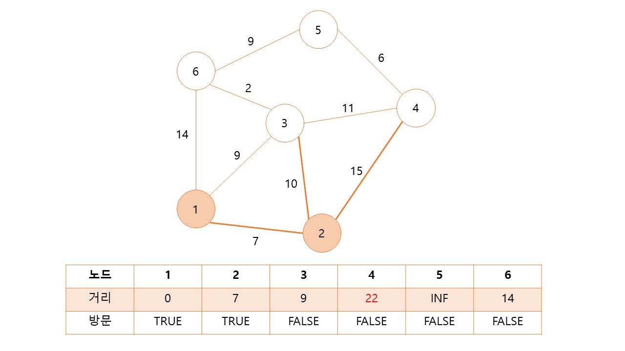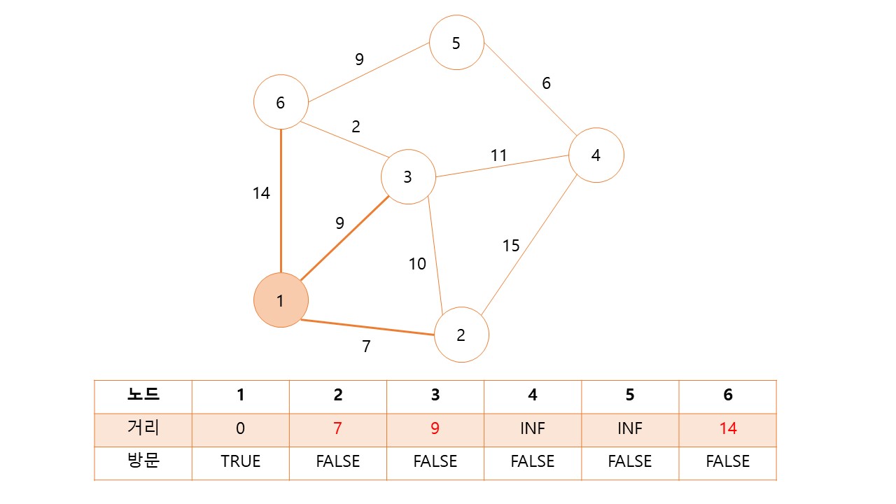 1번 노드에서 갈 수 있는 2번, 3번 6번 노드에서 모두 거리가 INF로 저장되어 있으므로, 각 노드까지의 비용으로 갱신해준다.