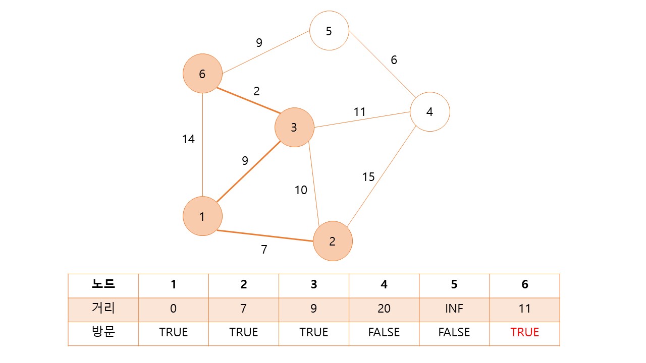 1번 노드로부터 가장 거리가 짧은 6번 노드를 방문한다.