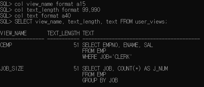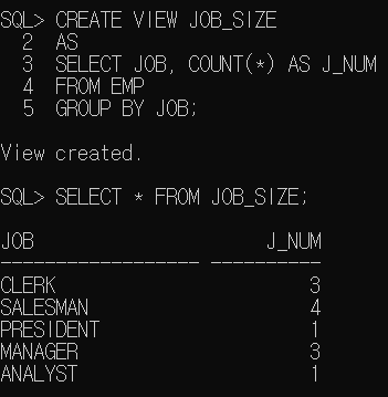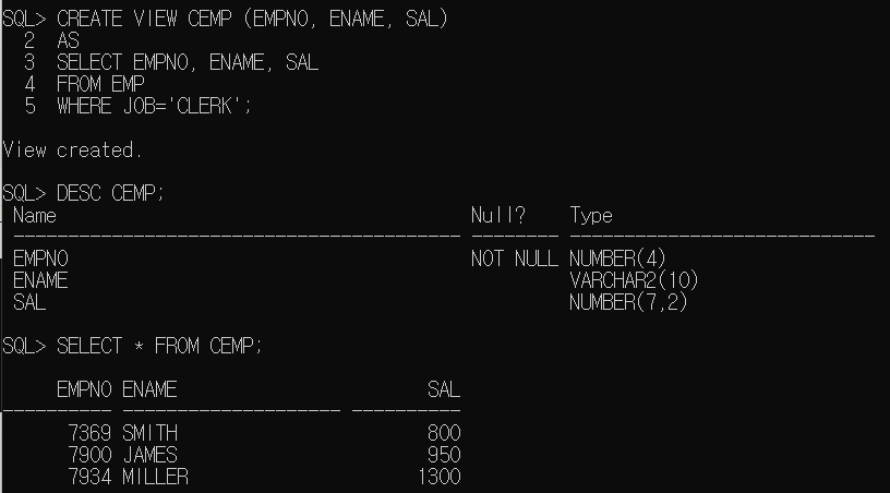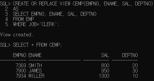 EX) 1. 직업이 'CLERK'인 직원의 정보를 저장하는 view 생성하기