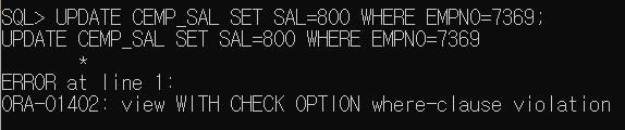 CEMP_SAL에서 직원번호가 7369인 직원의 월급을 800으로 바꾸려고 하면 CEMP_SAL 뷰의 조건이 월급이 900이상이어야 하기 때문에 에러가 발생한다.