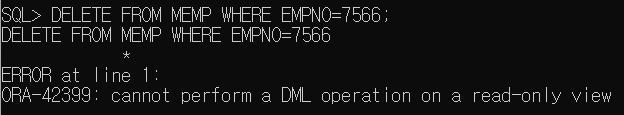 MEMP 뷰에서 직원번호가 7566인 직원의 데이터를 삭제하려고 하면 에러가 뜬다.