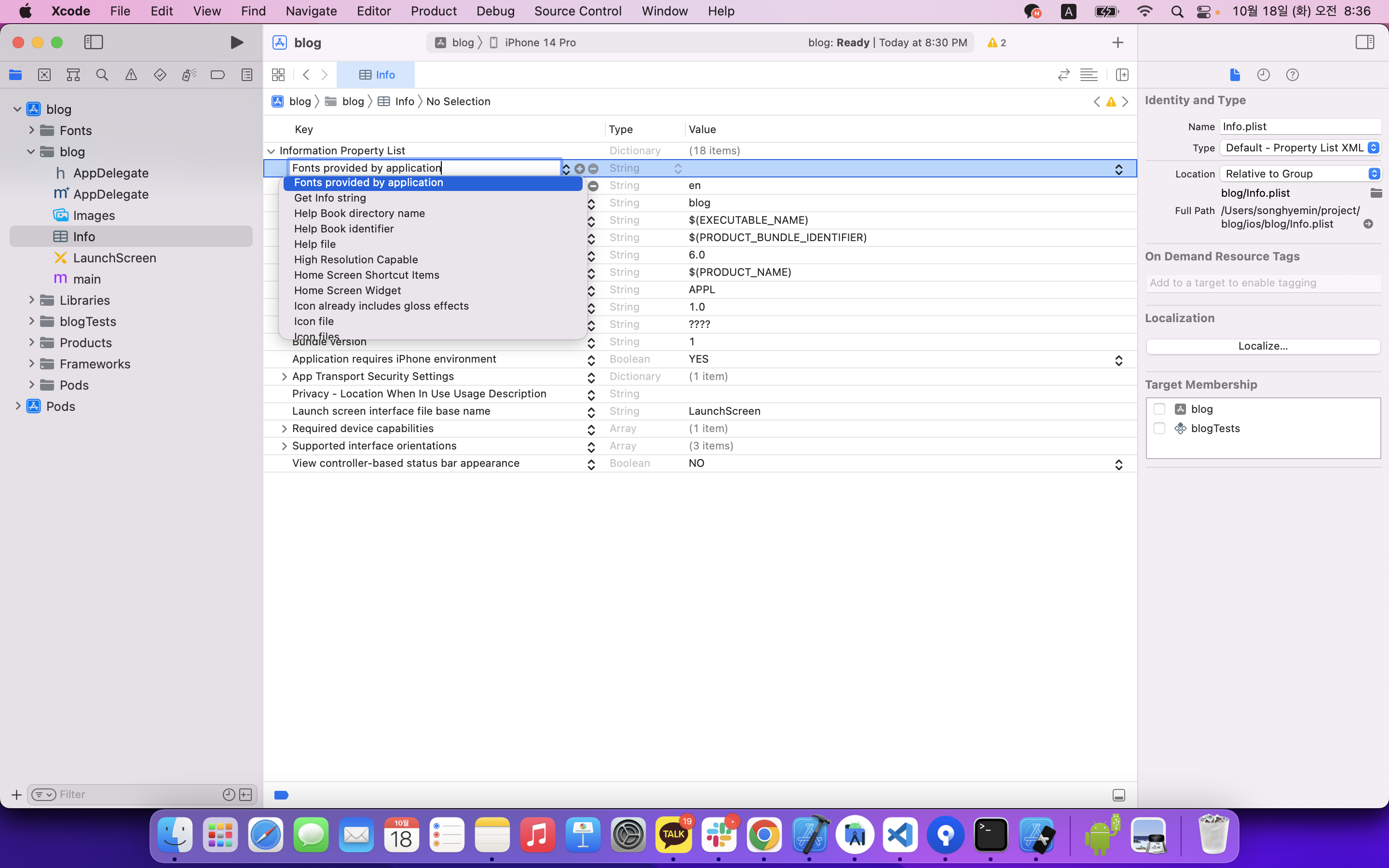 3. projectName > projectName > Info.plist에 Information PropertyList 아래 아무거나 클릭한 후 뜨는 +버튼을 클릭하여 Fonts provided by application 추가
